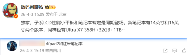 笔记本方面,该博主爆料称,新款REDMI笔记本将提供14英寸和16英寸两个版本,搭载Ultra X7 358H处理器,最高可选32GB内存+1TB固态硬盘。此前有消息称,小米笔记本Pro 14时隔近三年即将回归配资之家,定位为AI超轻薄旗舰笔记本,机身重量控制在1kg左右。小米产品营销总监马志宇曾表示,新品承载了太多人的期待和希望。
